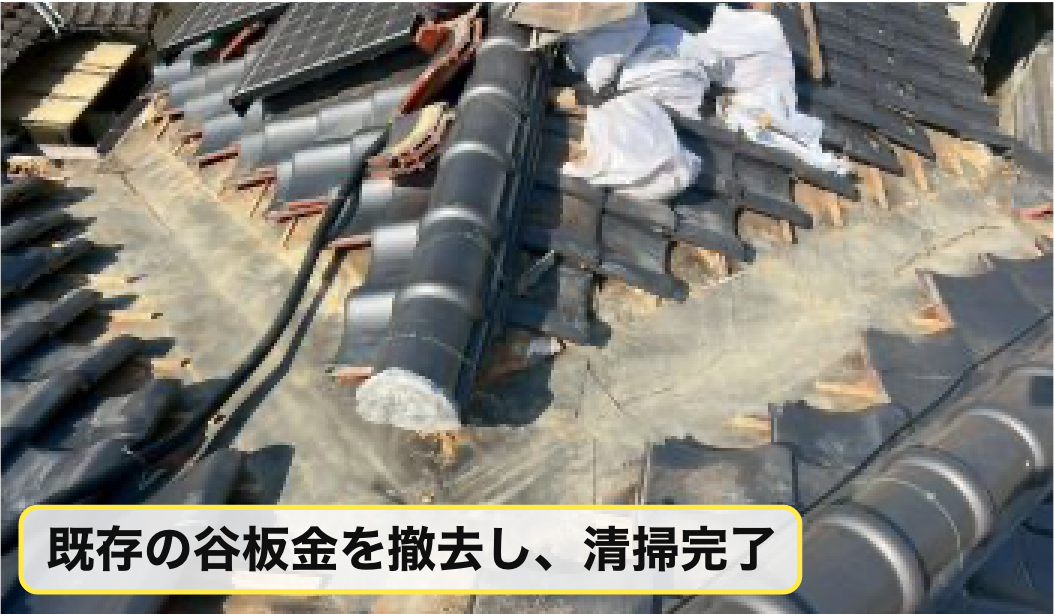 既存の谷板金を撤去するため周辺の瓦も一度はがし