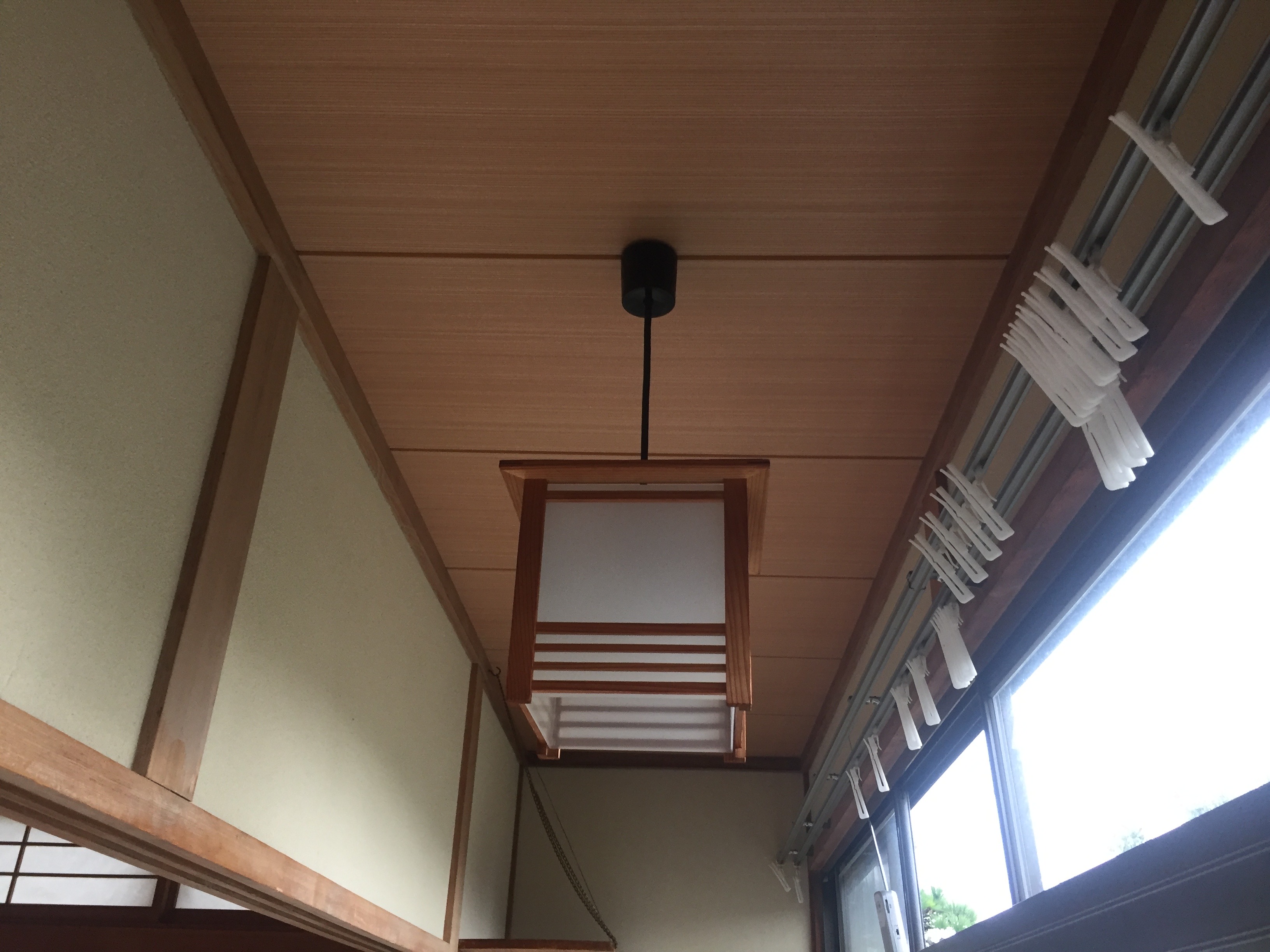 和室と縁側の天井を既存木質天井を解体し、新たに木質天井材で修繕させて頂きました。