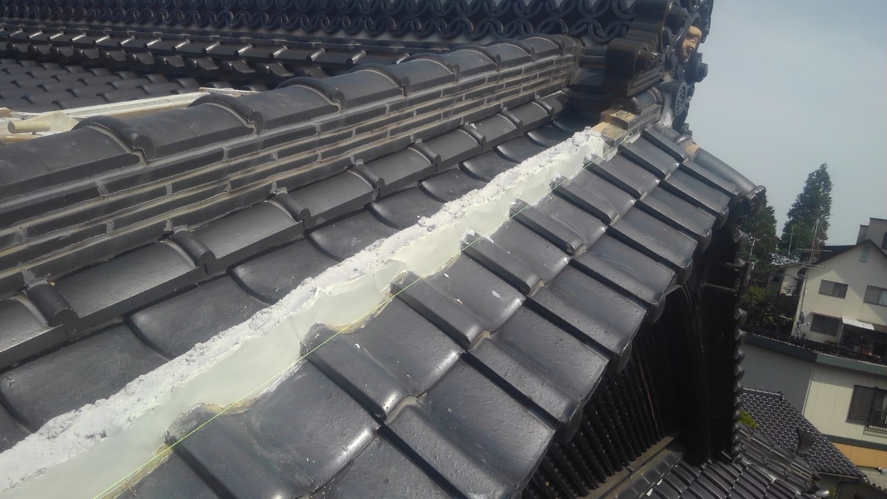 今回の工事では本棟から少し下にある下り棟に水が周り、漆喰が剥離し、中の赤土が流れでていました。下り棟をバラし、新たに棟を伏せ替えました。
