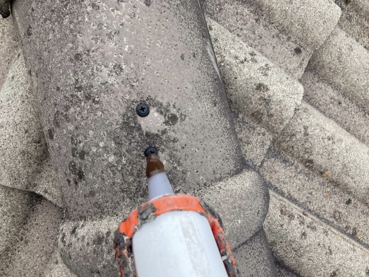 ビスを打った後は、ビスの頭の露出している部分を瓦止めコーキングをし、雨水などでビスが錆ないよう、防水処理で保護しています。