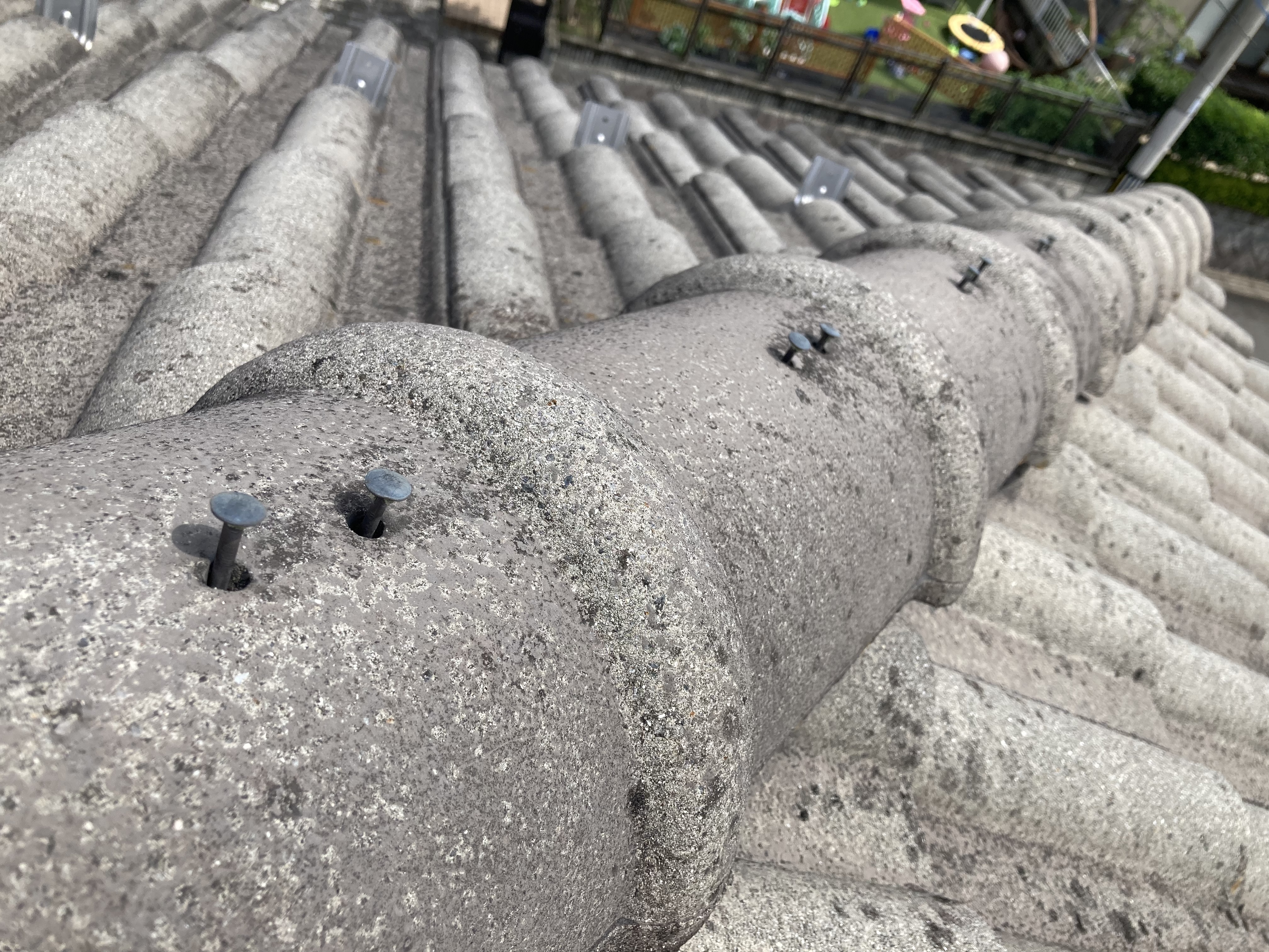 原因として、棟に被せてあるがんぶり瓦をめくってみると、内部の木材(棟木・心木)の収縮により打っていた釘が徐々に浮いてしまい抜けに繋がっていたことが原因と考えられました。