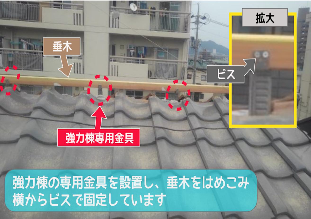 見た目はシンプルな作りになりますが棟の中にある垂木は強力棟金具にしっかり