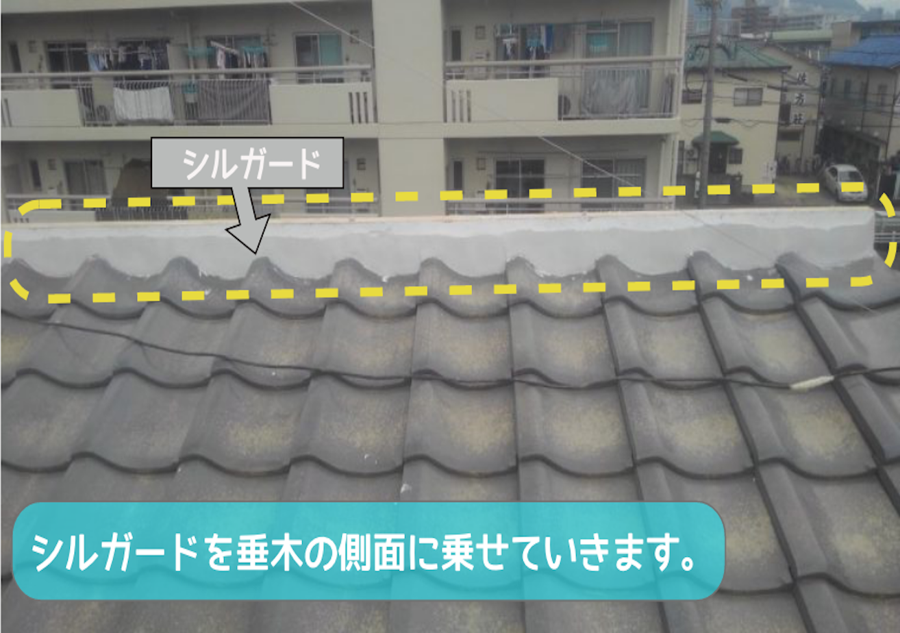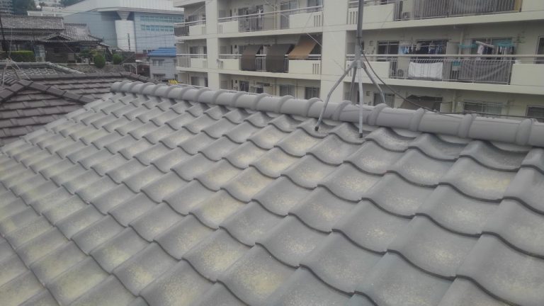 今回の工事では現状3段に積まれていたのし瓦をがんぶり瓦のみの強力棟に積み替え、2階の側面部分の瓦は調整後、コーキングにて瓦どめをして固定しています。
