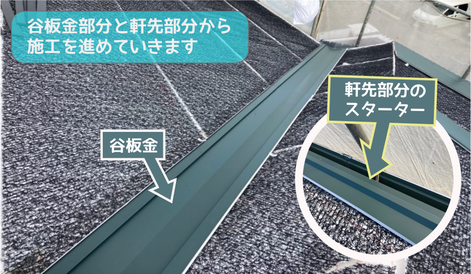 今回はカラーベスト屋根を横暖ルーフαプレミアムSを使用し、カバー工法を行いました。こちらは超高耐候のフッ素樹脂遮熱鋼板を採用している商材となります。カラーはグリーンとなっております。また今回はエアギャップシートを使用するにあたり、下地にはタイベックシートという優れものを使用しております。