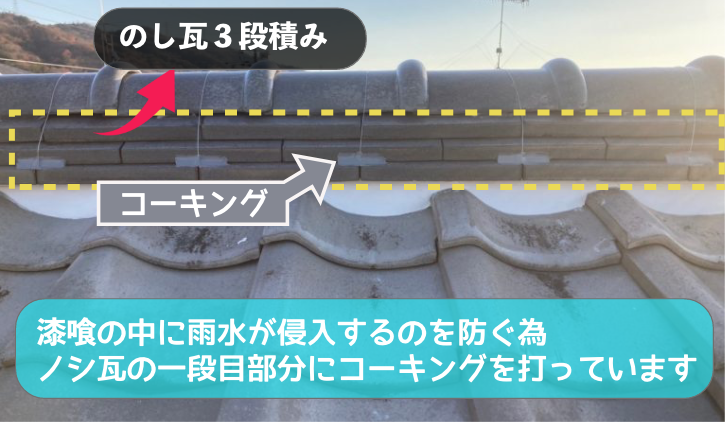 - 1階・2階棟漆喰及・のし瓦コーキング止め・瓦差し替え
