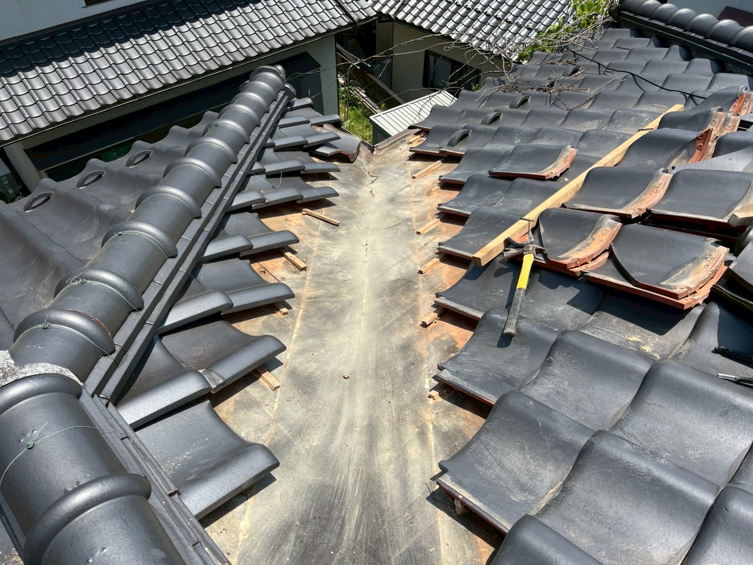 既存の谷板金を撤去するため周辺の瓦も一度はがし