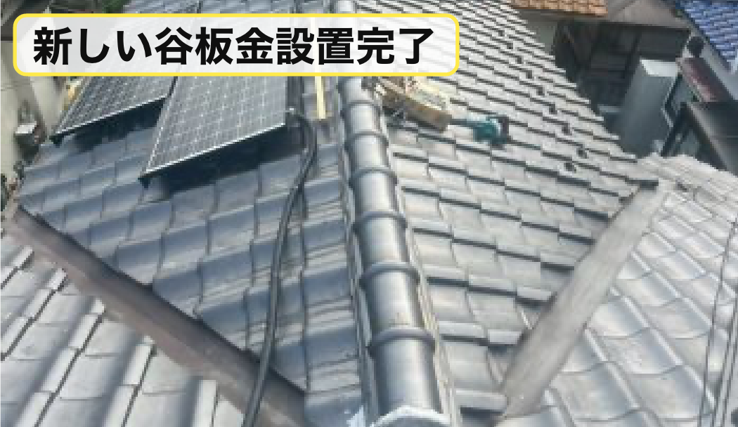周辺の瓦を復旧し、谷板金の施工は完了しております。