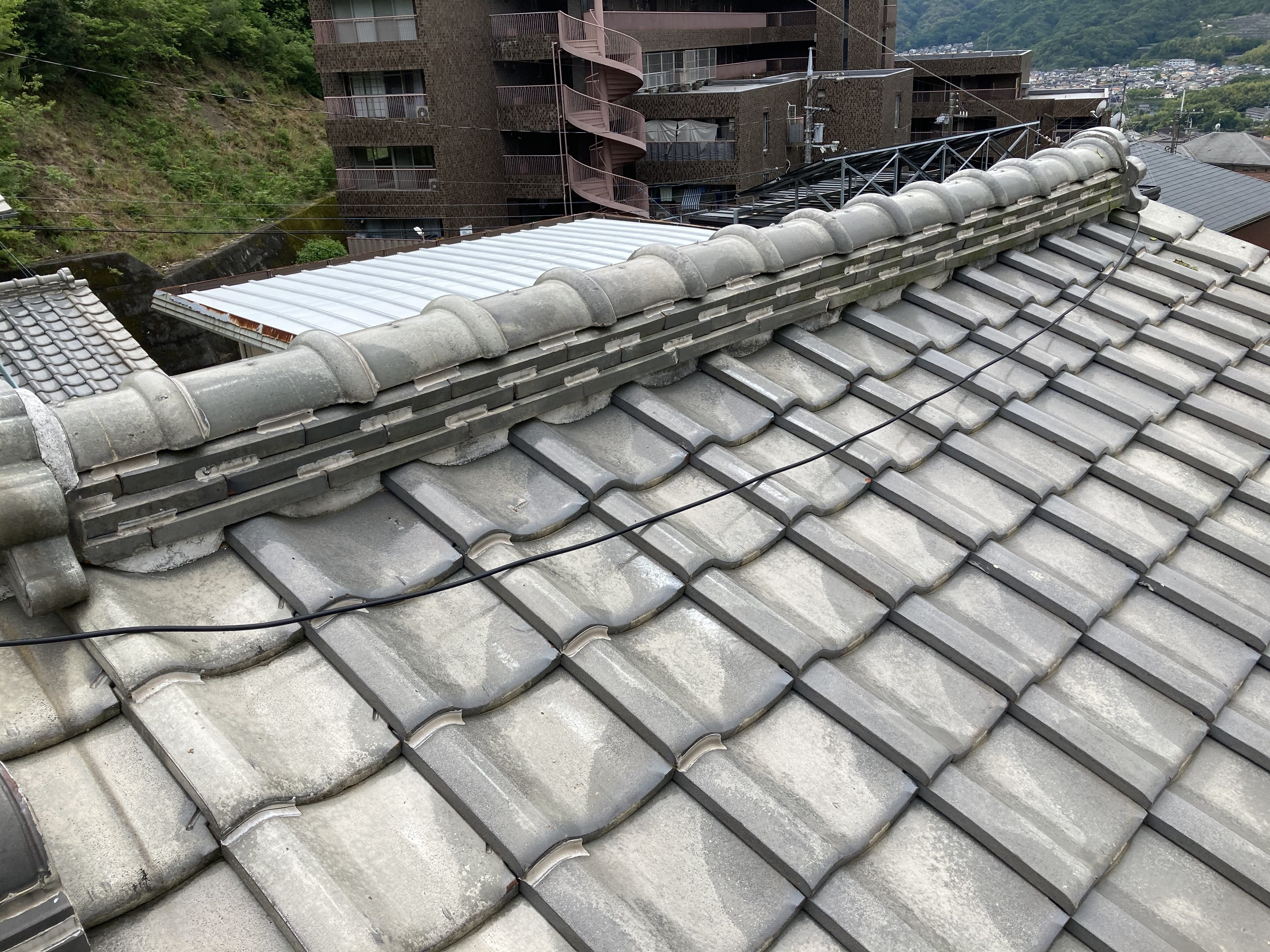 屋根点検の際に漆喰の浮いている箇所や瓦のずれなどを確認しました。今回の施工では棟を積み替えた際に強力棟での施工を進め、以前より強度のある強い棟になりました。また、瓦を葺き替える際に今までは雪どめ金具をつけていた状態でしたが今回は瓦にあらかじめ雪止めがついたもので施工しています。