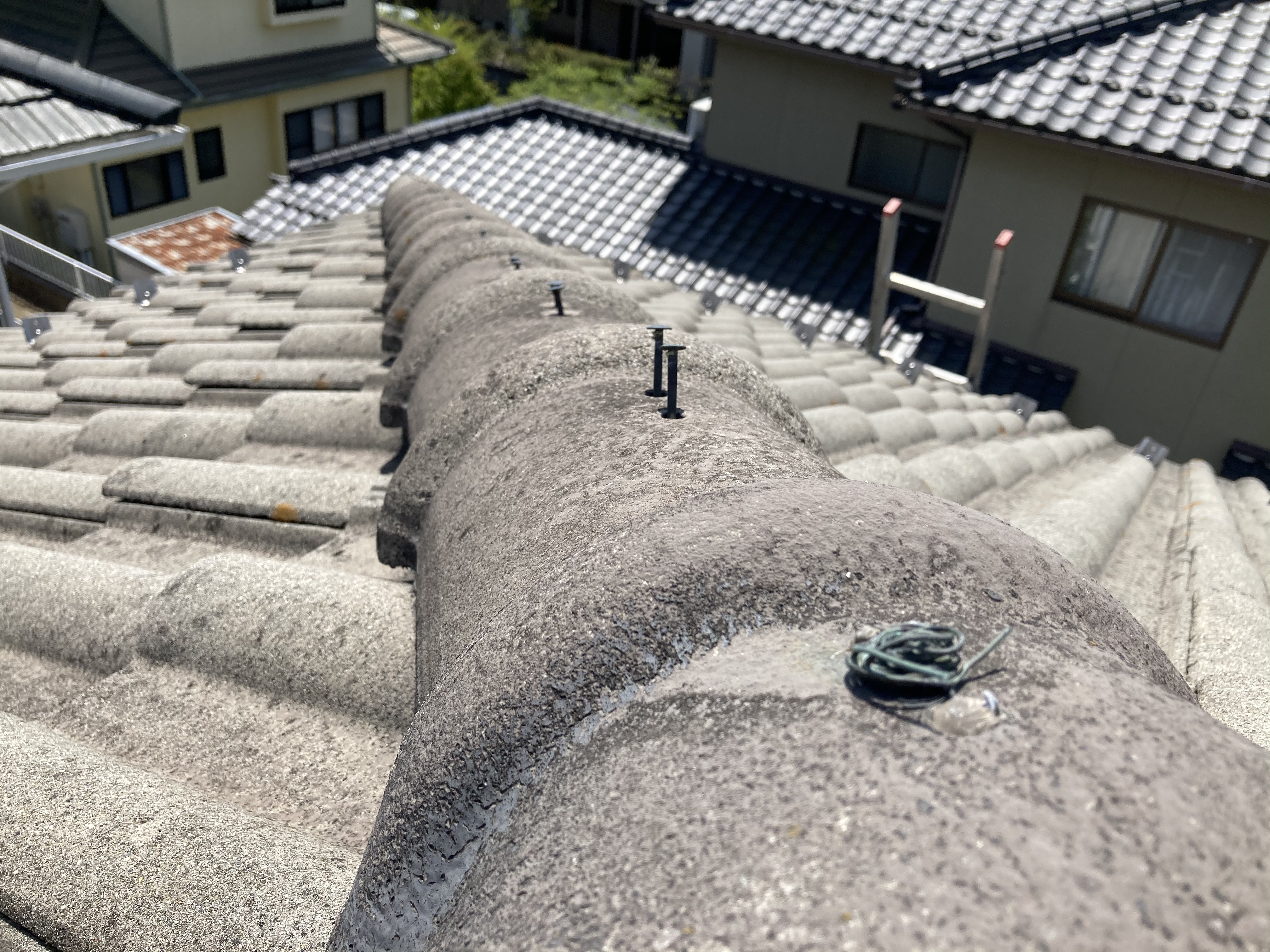 原因として、棟に被せてあるがんぶり瓦をめくってみると、内部の木材(棟木・心木)の収縮により打っていた釘が徐々に浮いてしまい抜けに繋がっていたことが原因と考えられました。