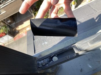 ここから柱に向かい雨水が入らないよう、突き当たりにコーキングし防水テープを張り込んで行きます
