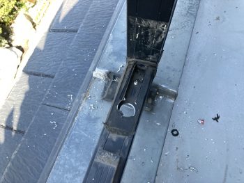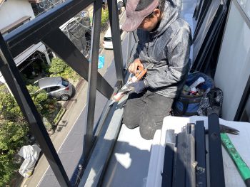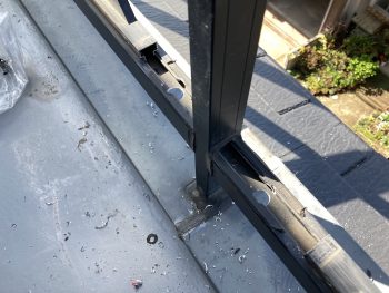 その後クロスしているアルミの角材の足元から水が角材に回らないようシーリングを施しパンチングパネルを復旧していきます