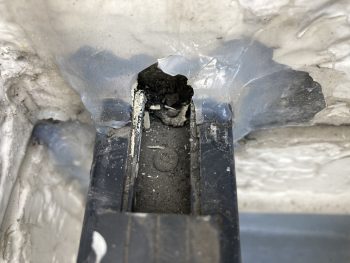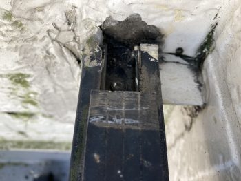 大雨の時などその水抜き穴でも排出しきれない雨水が柱の中に入ろうとしても、突き当たりにコーキングで防水処理していることから、ちょっとやそっとでは水が回らないように心がけ作業いたしました。