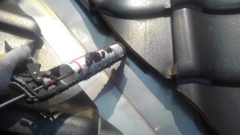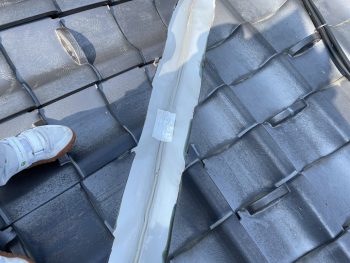谷板金の補修の際、谷周りの高さ調整の瓦が滑り落ち、谷板金に転がっているものもありましたので、復旧し、同じことが起きないように補強しております