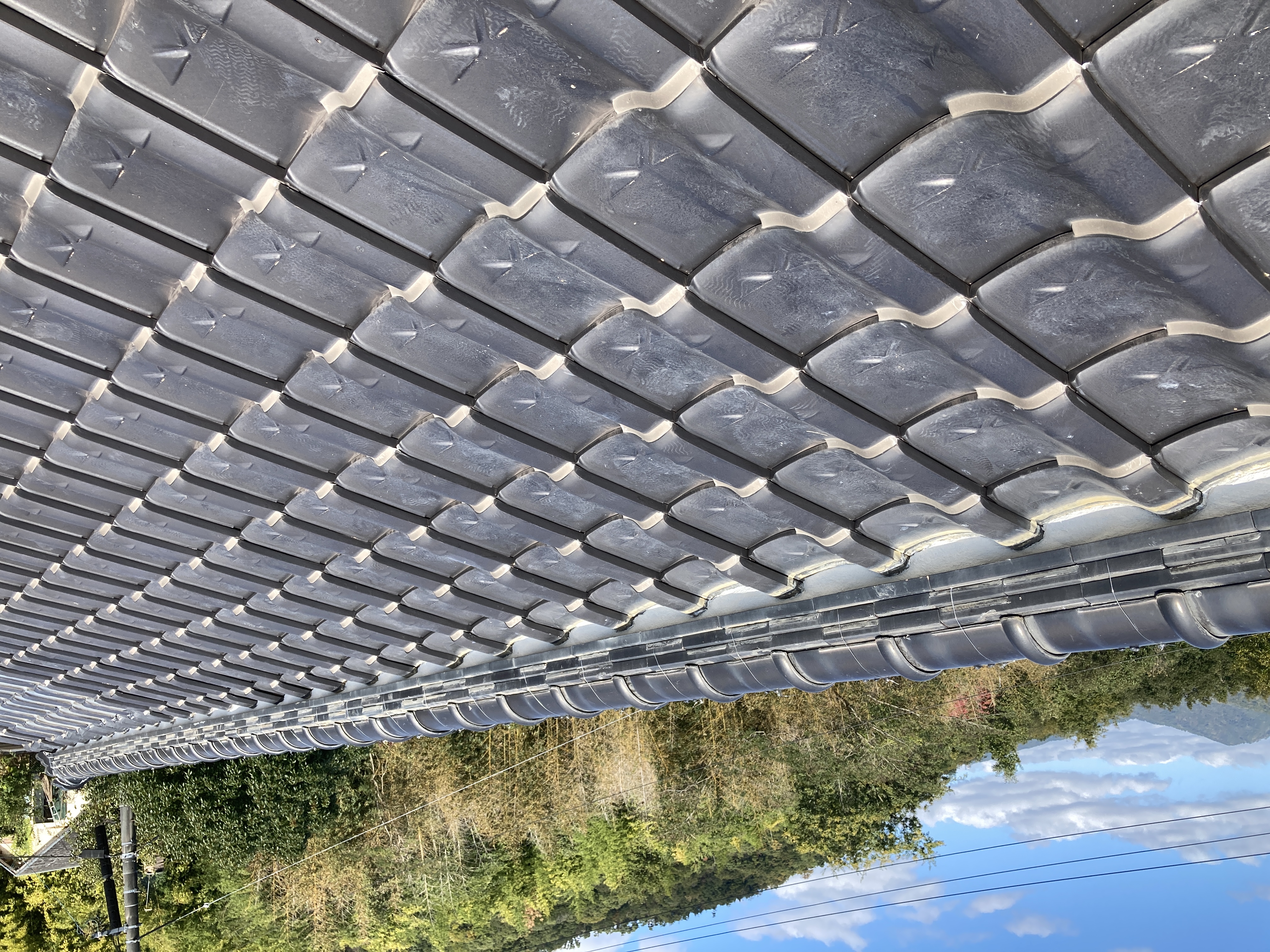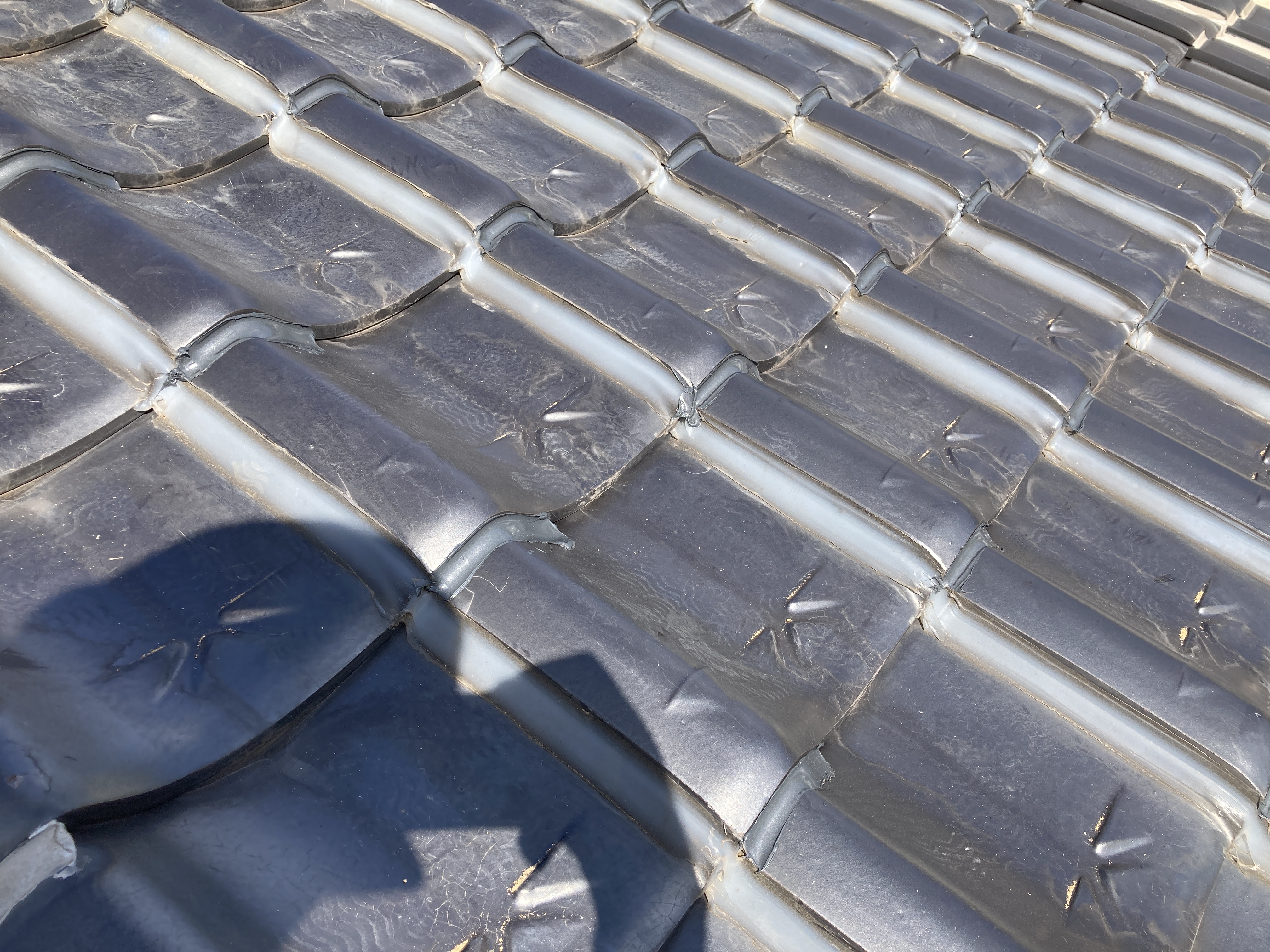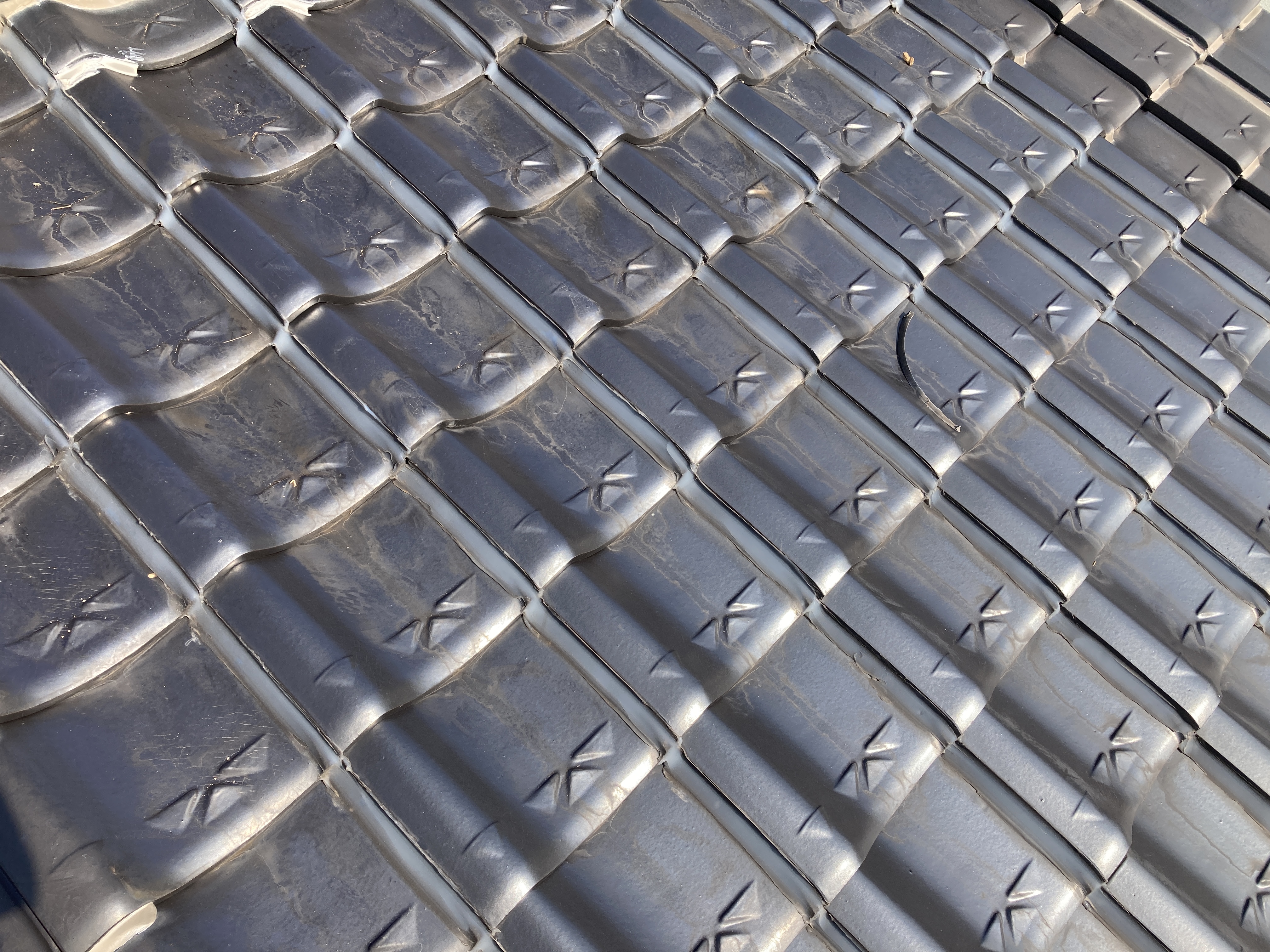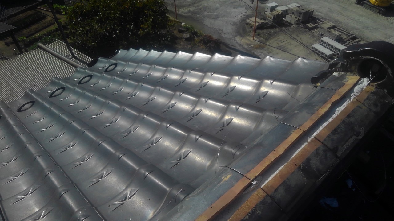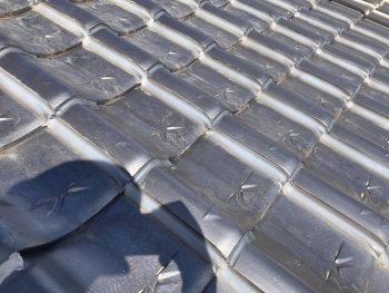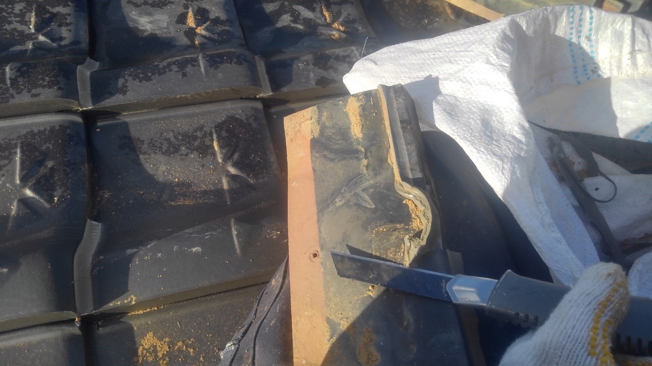 瓦に付着しています瓦止めコーキングを切り取り、屋根土=シルガードを置いた部分へ並べて固定致します。
