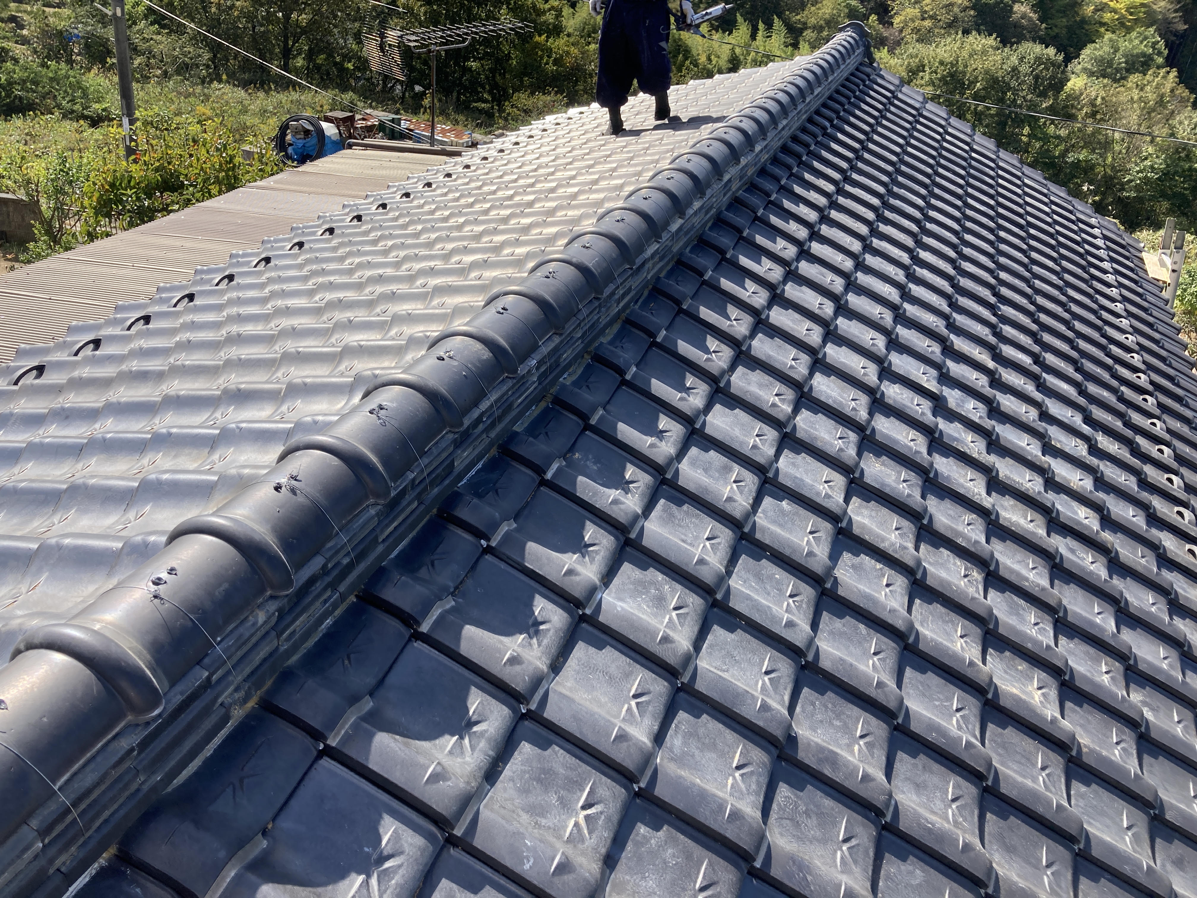 雁振りを全て並べ終えた後は鬼瓦の接部を瓦止めコーキングにて防水し棟伏せ替え工事が終わりました。