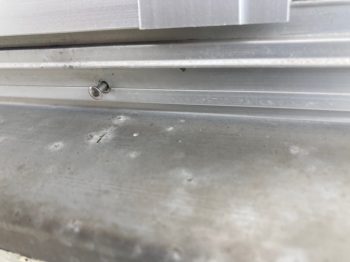 次にサッシ下の水切りと固定する際に降っている釘が浮いていたため釘をつたって台風等の雨風で室内に侵入する場合もございます