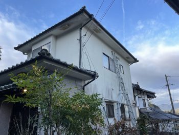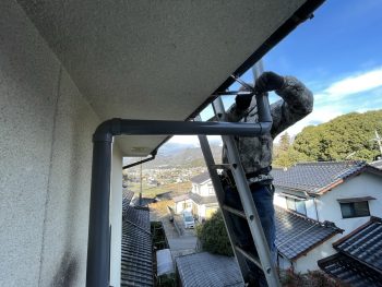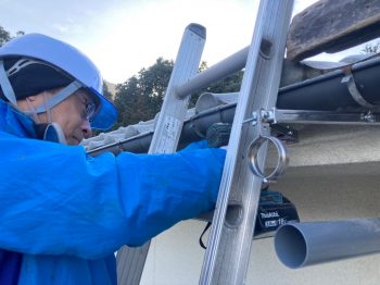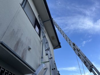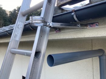 足場がないため2本の2連梯子を使い取り付けて行きます。