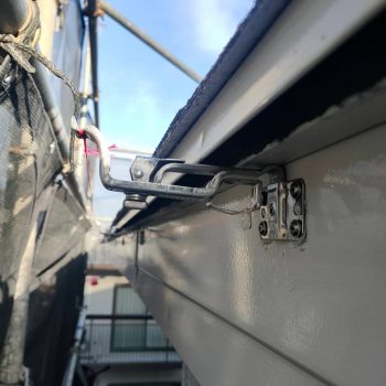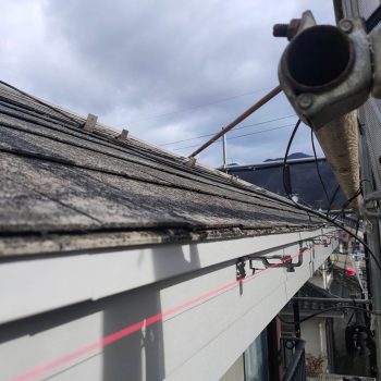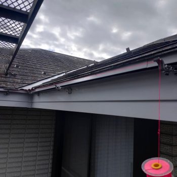 まずは雨どいの金具を取り付けていきます。金具は水糸(ピンクの糸)と呼ばれる糸を貼り、勾配を見ながら金具を取り付けて行きます。