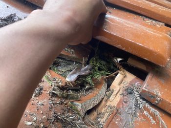 まずは刺さった枝の撤去や屋根の掃除から進めて参ります