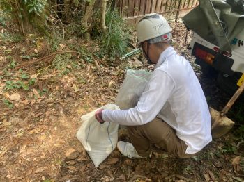 土嚢は黒いものを使い、通常のものよりも耐久年数があります。なお、土嚢と土嚢をつなげている線も、マイカ線と呼ばれる耐久性のあるものを使用しております