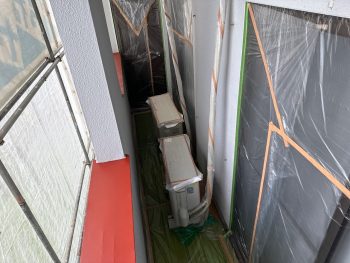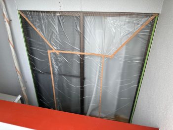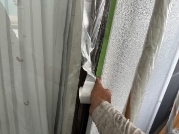 次に、開口部などの塗らない箇所に養生と呼ばれるビニールシートを貼っていきます。