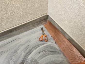 デッキ材を取り除いた後は、下地処理を施し、立ち上がりにメッシュを張り、ウレタン塗膜防水で仕上げていきます
