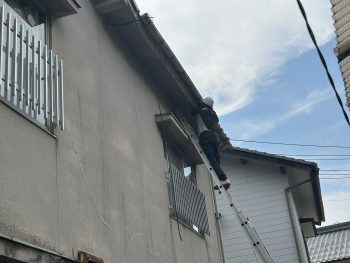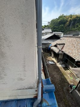まずは、雨漏りしていた上の雨樋の交換から行いました。