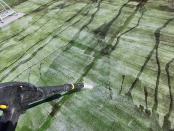 続いて、屋上面に塗膜防水処理をする為にまず洗浄作業をおこなっていきました。